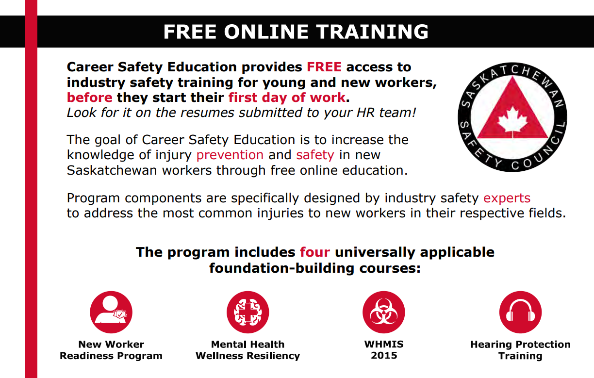 The Saskatchewan Safety Council’s Career Safety Education program offers free online safety training that prepares students for safe entry into the workforce through foundational and industry-specific courses.